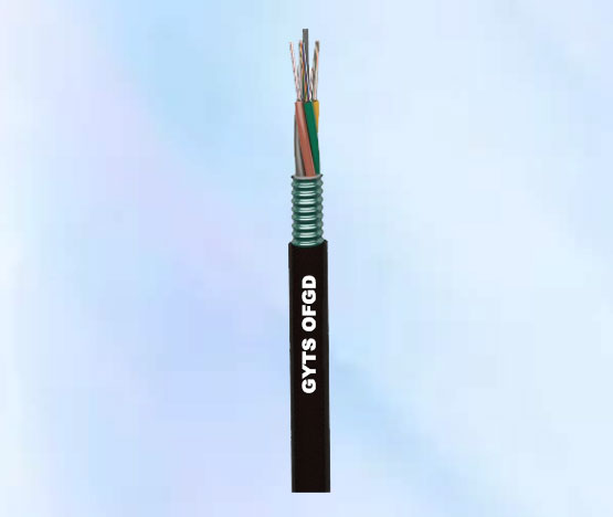 GYTS 光纜的結(jié)構(gòu)是將 250μm 光纖套入高模量材料制成的松套管中,松套管內(nèi)填充防水化合物。纜芯的中心是一根金屬加強(qiáng)芯,對(duì)于某些芯數(shù)的光纜來(lái)說(shuō),金屬加強(qiáng)芯外還需擠上一層聚乙烯(PE)。松套管(和填充繩)圍繞中心加強(qiáng)芯絞合成緊湊和圓形的纜芯,纜芯內(nèi)的縫隙充以阻水填充物。雙面涂塑鋼帶(PSP)縱包后擠制聚乙烯護(hù)套成纜。