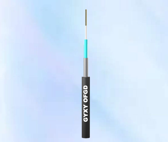 GYXY 光纜的結構是將 250μm 光纖套入高模量材料制成的松套管中,松套管內填充防水化合物。松套管外加阻水材料以保證光纜縱向阻水,兩側放置兩根平行鋼絲后擠制聚乙烯護套成纜。