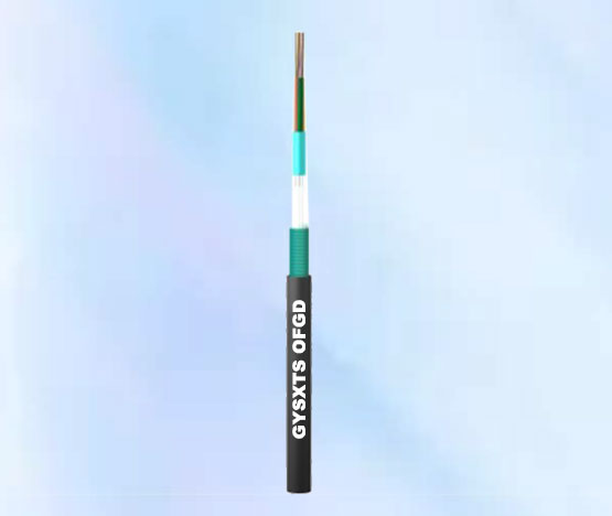 GYSXTS 光纜結構是多根單模光纖或多模光纖由高模量的樹脂材料經 UV 光固化成為相對位置固定的束狀光纖結構,再將多根光纖束套入的松套管中,套管內填充防水化合物。松套管外加阻水材料以保證光纜的縱向滲水,鋼絲繞包成纜后雙面鍍鉻涂塑鋼帶(PSP)縱包, 再在外擠制聚乙烯護套。